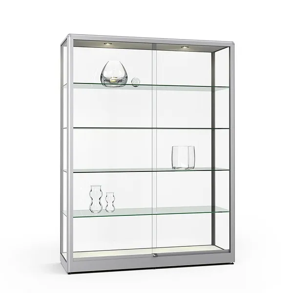Wandvitrine Glas mit Drehtüren - optional mit LED-Beleuchtung Profil-Ansicht von 32 mm - inkl. drei stufenlos verstellbare Glasböden - Geeignet für große und schwere Exponate - Belastung pro Boden 12kg Größen B×H×T:1020 × 1000 × 250 mm1220 × 1000 × 250 mm1520 × 1000 × 250 mm Sondermaße? Keine Problem - wir fertigen Ihre Glasvitrine nach Maß! Beleuchtung - optional mit LED-Strahlern wählbarMontage - vorgerichtet für Wandmontage, inkl. BefestigungsmaterialÖffnung - Zwei SchiebetürenVerglasung - Einscheiben-Sicherheitsglas / ESGBrandschutz - optional mit Metallblechfüllungen statt Schichtstoffplatten im Deckel und BodenOberfläche - Eloxierung in matt-silber (E6/EV1) oder RAL Farbton nach WunschBeleuchtung - ohne Beleuchtung - optional: Beleuchtung mit LED-Strahlern, in Deckenbereich integriertSchließung - Sicherheitsschloss mit 2 Schlüsseln